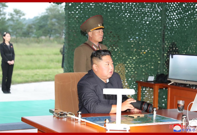 9月10日,金正恩指导超大型火箭炮试射,朴正川站在其身旁。(朝中社)