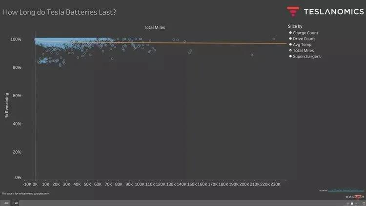 而这并不是个例,在美国特斯拉车主社区Teslanomics上,就有一份报告,大部分的车主在行驶10万英里后,电池仍然可以达到原有90%的续航能力。可能这也是为什么特斯拉在电动汽车行业成为大哥的原因吧!