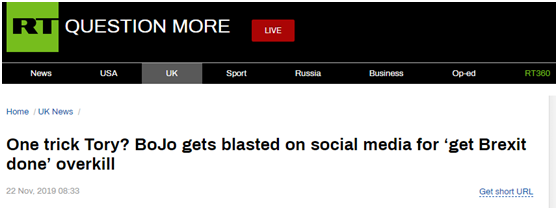RT评论称,约翰逊这样重复口头禅的做法惹怒了社交媒体上的网民,大家纷纷发文嘲讽约翰逊。↓