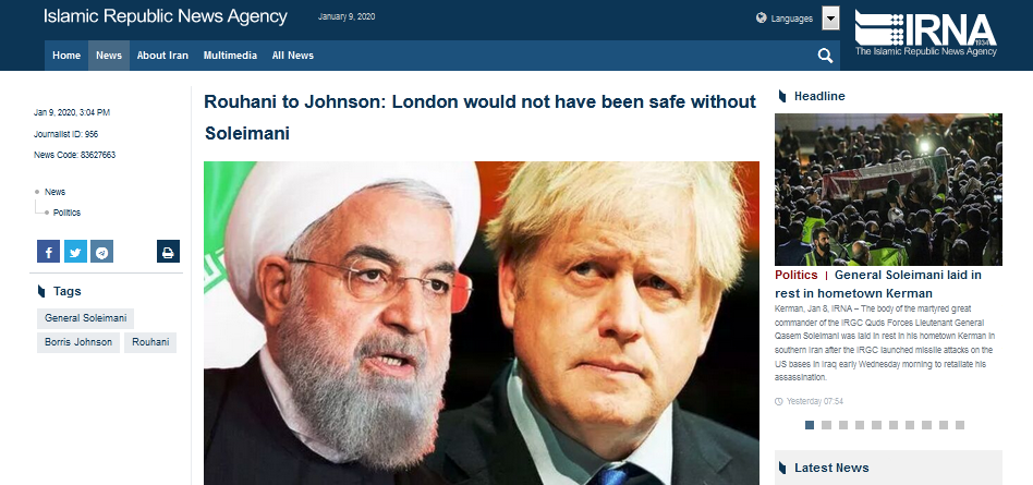 伊朗高级军官苏莱曼尼上周在美军空袭中身亡,鲁哈尼谈及此事时“建议”约翰逊说,英国不应追随美国领导,要改变对苏莱曼尼的态度,因为英国的安全与稳定都要归功于这位已故的伊朗高级军官。
