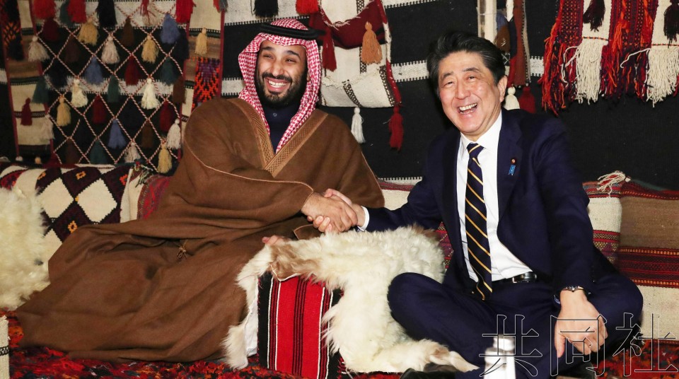 当地时间1月12日晚,日本首相安倍晋三与沙特王储穆罕默德·萨勒曼在沙特西北部欧拉市近郊、萨勒曼的别墅中举行会谈。