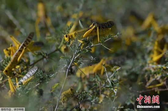 资料图:图为当地时间2020年1月21日,在肯尼亚Archers Post附近的拉里索罗村,蝗虫飞过灌木丛。图片来源于中新网