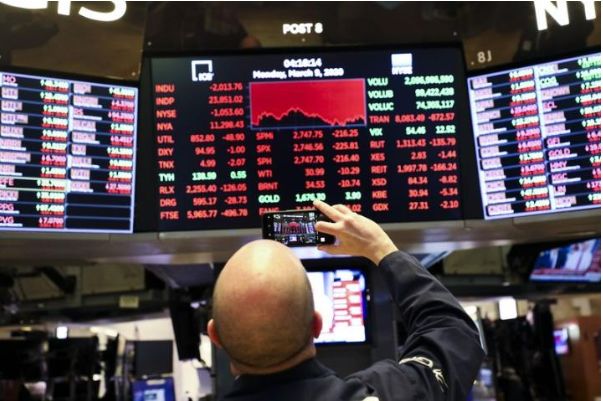 3月9日,在纽约证券交易所,一名交易员收盘后拍摄显示当天交易情况的电子屏留念。新华社记者王迎 摄