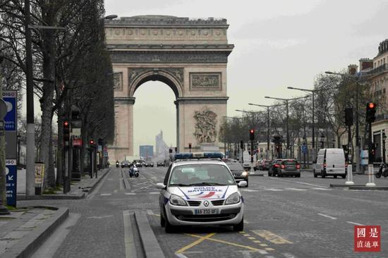 当地时间3月17日,巴黎香榭丽舍大街上车辆稀少。中新社记者 李洋 摄