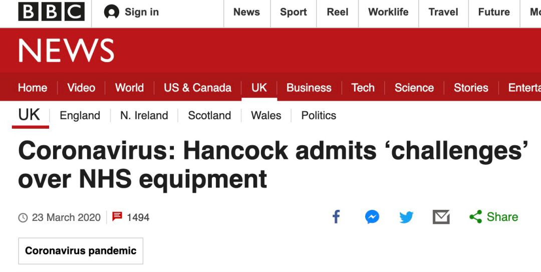 △BBC:英国卫生大臣汉考克承认向NHS工作人员提供个人防护设备存在“挑战”