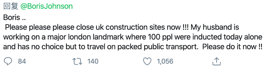 “鲍里斯,请立即关闭英国建筑工地!我的丈夫正在伦敦一个建筑工地上工作,一天就有100人入职。他还只能乘坐拥挤的公共交通工具出行。请现在就关闭建筑工地!”