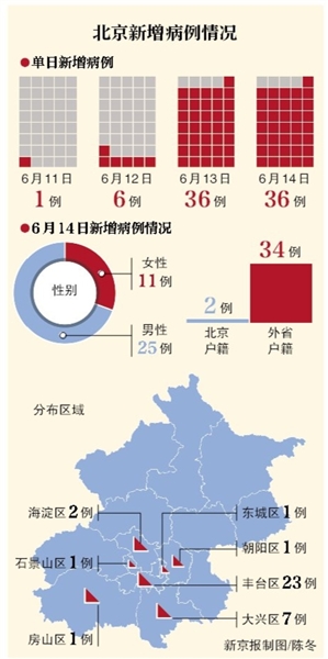6月15日,北京召开两场疫情防控新闻发布会。据北京市疾控中心副主任庞星火通报,6月14日0时至24时,北京新增新冠肺炎确诊病例36例,已完成流调的34例均与新发地市场有关,还有2例正在流调中。