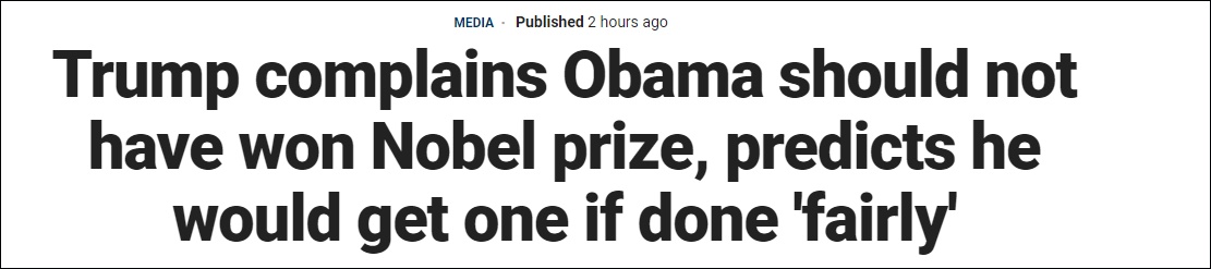 特朗普继续向记者抱怨:“如果他们公平地颁发,我想我将会因为很多事情获得诺贝尔奖,但他们没有。”同时他对奥巴马得到诺贝尔和平奖自己却没有,表达了不满:“他们在奥巴马就任总统后立即给了他一个,他说他不知道为什么会得到这个。你知道吗?这是我唯一同意他的一点。”(观察者网注:2009年,奥巴马因“为加强国际外交和人民之间的合作做出了非凡的努力”而被诺贝尔奖颁奖委员会提名并获奖。)