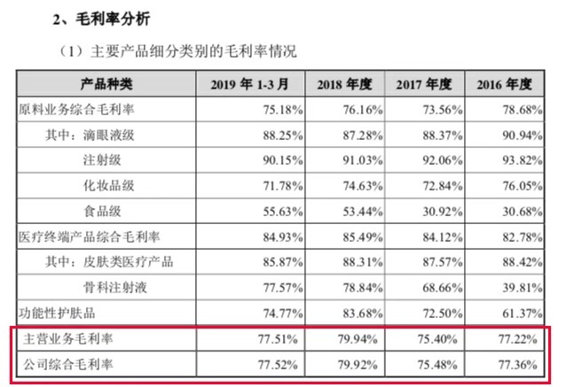 与此同时,华熙生物的产能也不断放大,透明质酸产量从2000年的0.8吨,增长到2018年的近180吨,产业化规模位居国际前列。值得一提的是,2016至2018年度,华熙生物主营业务的毛利率分别为77.22%、75.40%和79.94%,综合毛利率一直保持着接近80%的较高水平,被业界评价为已“堪比茅台等优质白酒企业”。