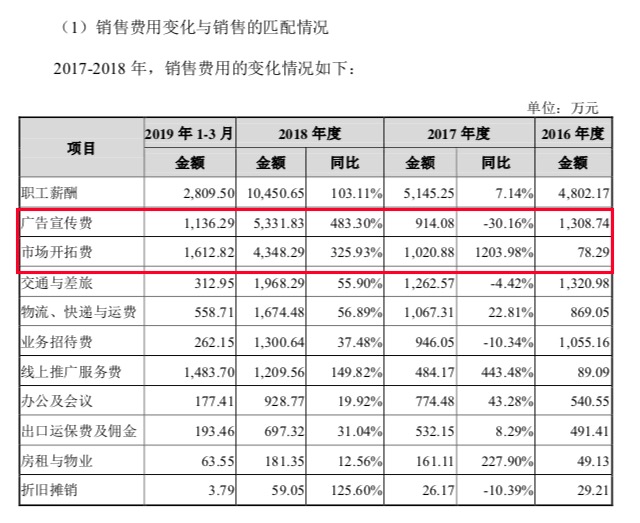 与研发投入形成鲜明对照的是,2016-2018年,华熙生物的销售费用高速增长,分别为1.07亿元、1.25亿元、2.84亿元,占对应年份营业收入的比例分别为14.60%、15.34%和22.46%。其中,广告宣传费在2018年大幅飙升,同比增长483%,市场开拓费同比增长326%。