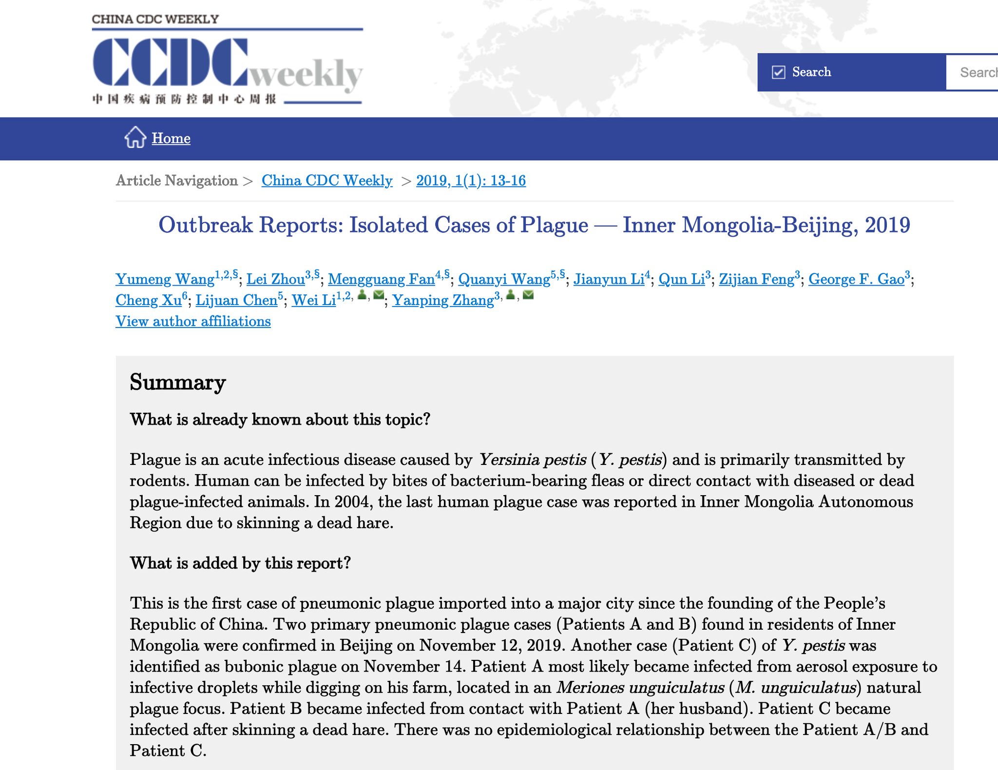 新京报快讯(记者 许雯)中国疾控中心日前上线的英文版周报中首次披露内蒙古三例鼠疫病例详情。报告显示,来京就诊的两名原发性肺鼠疫患者为夫妻,丈夫很可能在自家农场挖土时吸入带有鼠疫菌的气溶胶感染,妻子很可能与丈夫接触而感染。另一名腺鼠疫患者给死野兔剥皮后被感染。