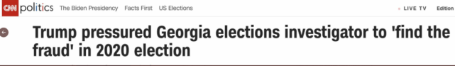 当时,《华盛顿邮报》在这篇报道中宣称,一个无法透露身份的“知情人士”说特朗普曾在去年12月23日给美国佐治亚州负责调查去年美国总统大选是否存在舞弊的调查人员打去电话,要求调查人员必须“找出欺诈”,还说只要能“找出欺诈”,调查人员就将成为“国家的英雄”。