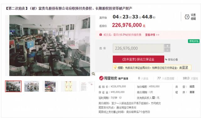 7月31日,富贵鸟公司曾发布公告称,公司正在进行破产重整,并将根据破产重整的进度安排复牌计划。截至10月12日10时30分,富贵鸟的破产拍卖仍未有人报名,共有77人设置提醒,引来1813次围观。