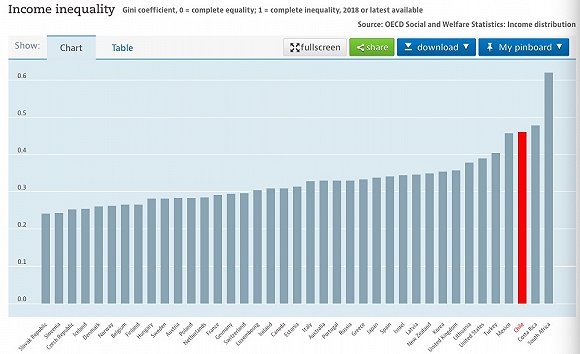 根据经济合作与发展组织(OECD)2018年的数据,智利的贫富差距指数为0.46,在OECD成员国中排名第3,仅次于南非和哥斯达黎加。