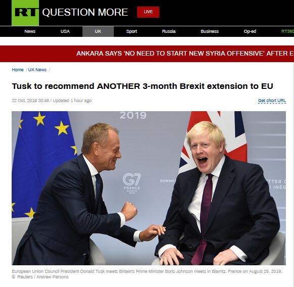 RT称,当地时间22日,图斯克表示,英国脱欧的最后期限应该从10月31日推迟至明年1月31日。