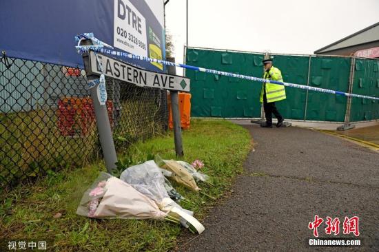 当地时间10月24日,英国埃塞克斯郡,人们在发现货车的地方献花悼念死者。图片来源:视觉中国