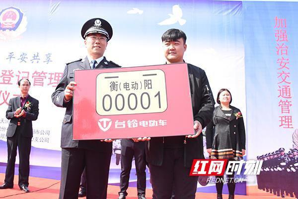 衡阳市电动车登记管理工作启动仪式上,衡阳市副市长、市公安局局长胡志文为市民授予“衡(电动)阳 00001”的电动车车牌。