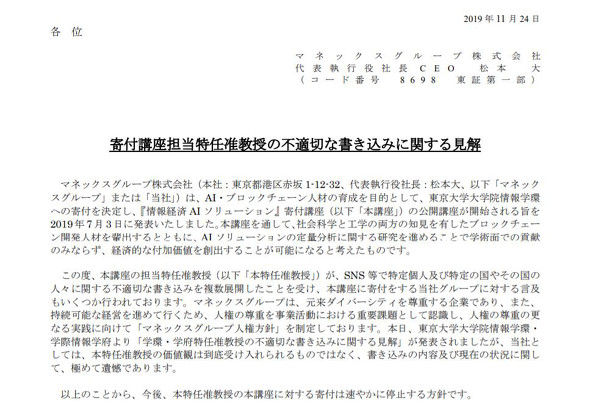 在大泽发表歧视中国人言论之后,其特别课程赞助商之一的日本Monex集团11月24日宣布,虽然早前东大发布声明称该男子言论与本校无关,但Monex方面还是无法接受该男子的观点,对于他的言论和导致的后果非常深感遗憾,并将中止对他所负责讲座的资助。
