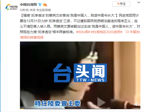 民进党团预计要在12月31日力拼“反渗透法”三读,不过遭到国民党质疑法案违反程序正义,定义不清恐害人被入罪。而蔡英文更被翻出过去说“我是中国人,读中国书长大”,对照现在力推“反渗透法”根本两套标准。