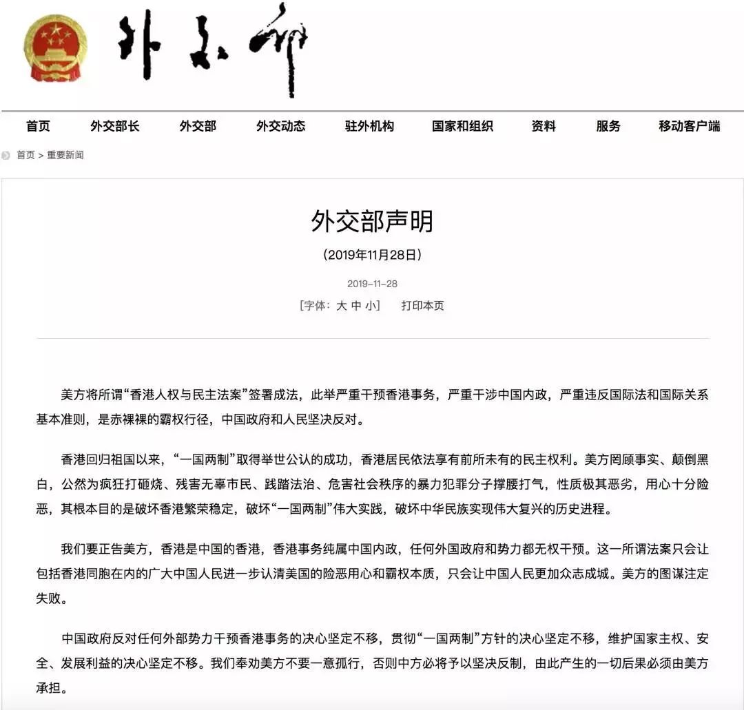 针对美方将所谓“香港人权与民主法案”签署成法一事,11月28日,外交部、国务院港澳办、香港中联办、外交部驻港公署及香港特区政府发表声明,强烈谴责美方。外交部召见美国驻华大使提出严正交涉。