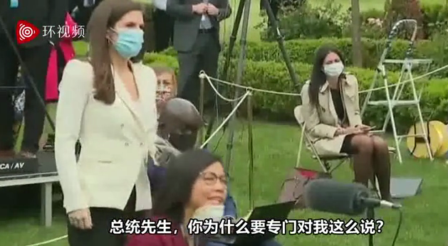 听到这回答,女记者迟疑了一下,也回头看了看,原本在她身后穿浅色衣服的女记者走到她身旁准备提问。这时亚裔女记者突然半起身,继续追问特朗普:“总统先生,你为什么要专门对我这么说,让我去问中国?”