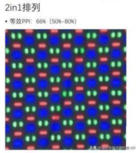 而京东方制作的 OLED 普遍采用的还是 2in1 排列(估计是为了绕开三星的专利),即前段时间闹得沸沸扬扬的“周冬雨”排列。