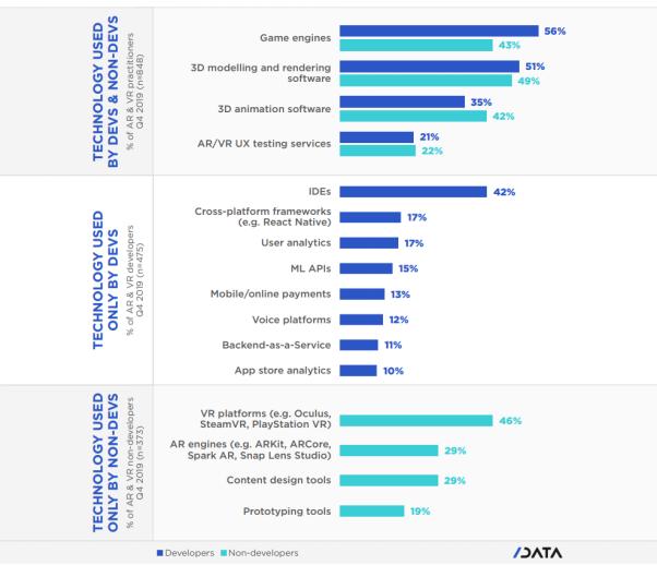 超过半数的开发人员使用游戏引擎,而48%的开发人员使用3D建模和渲染软件。这些技术在AR / VR开发人员中的广泛采用证明了他们提供的抽象技术可带来巨大的效率提升,而且很适合AR(尤其是VR)开发游戏。