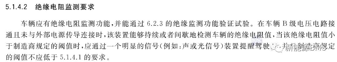 绝缘电阻监测功能与绝缘电阻的外部测量方法这里包括了两个内容:REESS 需要自身带有绝缘检测功能,而且 REESS 同时需要对外满足绝缘电阻要求,不要混淆。A. 新标准中明确提出了车辆应具有绝缘监测功能,基本上这个功能是要靠 REESS 中的 BMS来实现的,因为它距离电池最近。