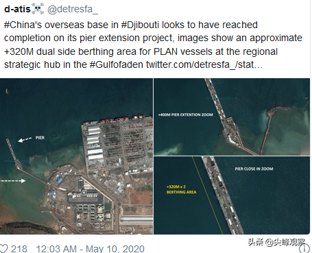 新浪网转引美国《福布斯》新闻报道,中国在持续扩建吉布提海外基地,规模不断增大,内部有大型直升机停机坪。去年,完成了一个1120英尺长的码头工程,这个体量的码头足可以容纳中国国产航母。