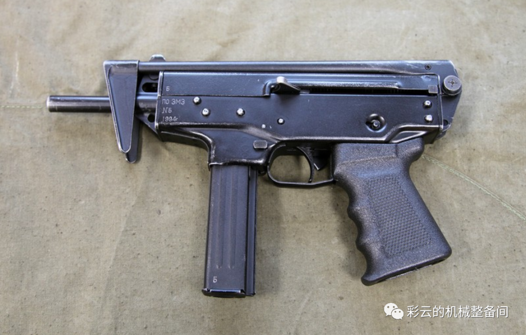 该枪采用常规布局,机匣用1mm钢板冲压成型,其他零件如枪托、准星、照门通过点焊、铆接的方式连接在机匣上;枪管光溜溜的一根,什么枪口装置都没有,突出在机匣前方;钢板冲压的折叠枪托不用时向上向前翻起,折叠在机匣顶部,抵肩板正好卡在枪管上;机匣右侧一个毛风扑面的大拨片式保险/单连发选择杆——总之既有俄式武器一贯的粗放狂野,又透着一股简易武器的末世废土风。