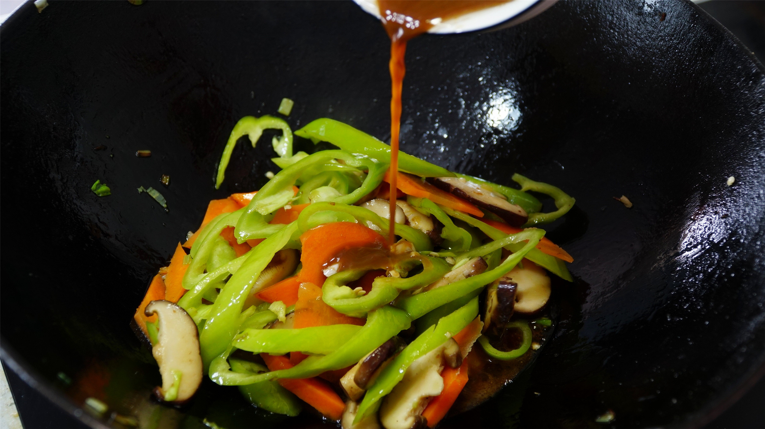 第五步:加入青椒片翻炒均匀后,淋入前面做好的料汁,大火翻炒收汁。