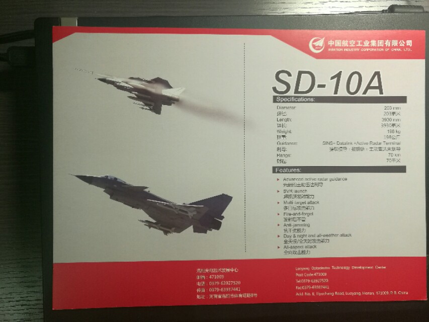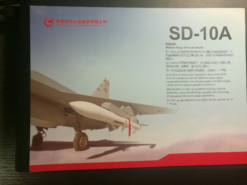 SD-10A空空导弹是先进的第四代主动雷达制导中距空空导弹,可在复杂电磁环境下攻击高机动目标、低空目标并具有多目标精确打击的能力。该型空空导弹具有制导精度高、杀伤概率大、抗干扰能力较强等特点。具备全天候,全高度、全方位攻击能力。SD-10A空空导弹具备多平台发射,在航展上笔者发现该导弹由空空型改进为地空型,充分说明这种导弹做到的通用化,据消息报道称该型导弹已经成功出口某国并形成作战能力。