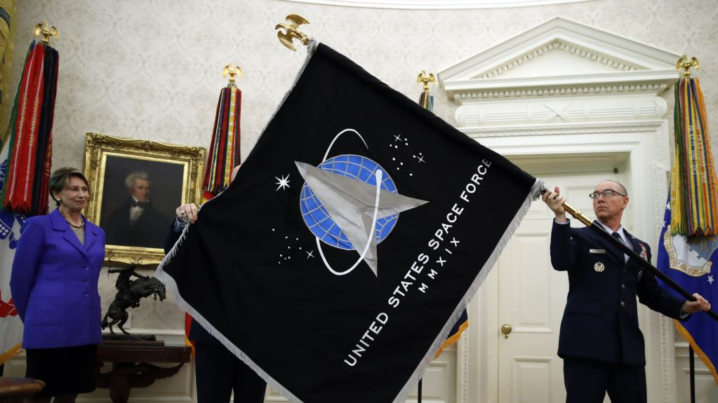(美国太空军军旗在白宫椭圆形办公室内展示)