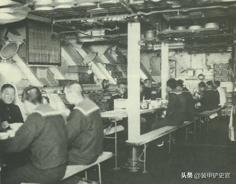 ▇水兵们在舰内居住区用餐一景。可以看到桌椅都是固定在甲板上的。