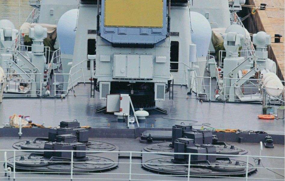 现代级的固定式导弹发射装置是典型的苏式设计,把舰桥两侧挖出来两个坑,两边各安装了一座四联装的反舰导弹发射装置。除了出口给我们的现代级,俄罗斯自己的光荣级和无畏级也都是这种设计。