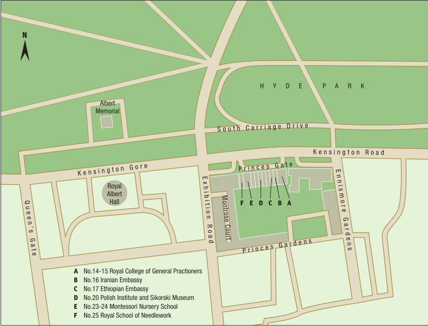 尽管做了这么多准备,整个行动还是令人望而生畏,因为大使馆有五层楼高,加上一个地窖,整个建筑里有五十多间房间。坚固的维多利亚式建筑花岗岩台地墙一边55.9厘米,另一边48.3厘米,在大使馆前面,唯一可行的进入方法是通过一楼阳台的窗户。这些窗户可能是用防弹玻璃制成的,必须用炸药把它们轰掉。经过长时间的搜查,警方找到了正在度假的使馆管理员。他对大使馆了如指掌,不仅知道主要房间的情况,而且几乎知道所有储藏室和扫帚柜的情况,并向当局提供了宝贵的信息,尤其是在最令SAS烦恼的问题,到底是一楼窗户是不是防弹的。他还透露大使馆的木门是一扇钢质安全门。剩下的一个谜是,他们是否像他们声称的那样放置了炸药来炸毁那座建筑物,