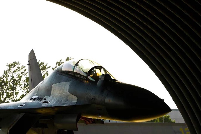 训练归来,夕阳下的歼16正缓缓回到它的"房间",机场的机库。