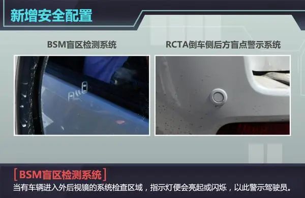 值得一提的是,普拉多3.5L车型新增了BSM盲区检测系统和RCTA倒车侧后方盲点警示系统两项安全配置。其中BSM盲区检测系统的作用为行驶过程中随时监测进入外后视镜盲区内的车辆,当有车辆进入外后视镜的系统检查区域,指示灯会亮起或闪烁,以此警示驾驶员避免发生危险。