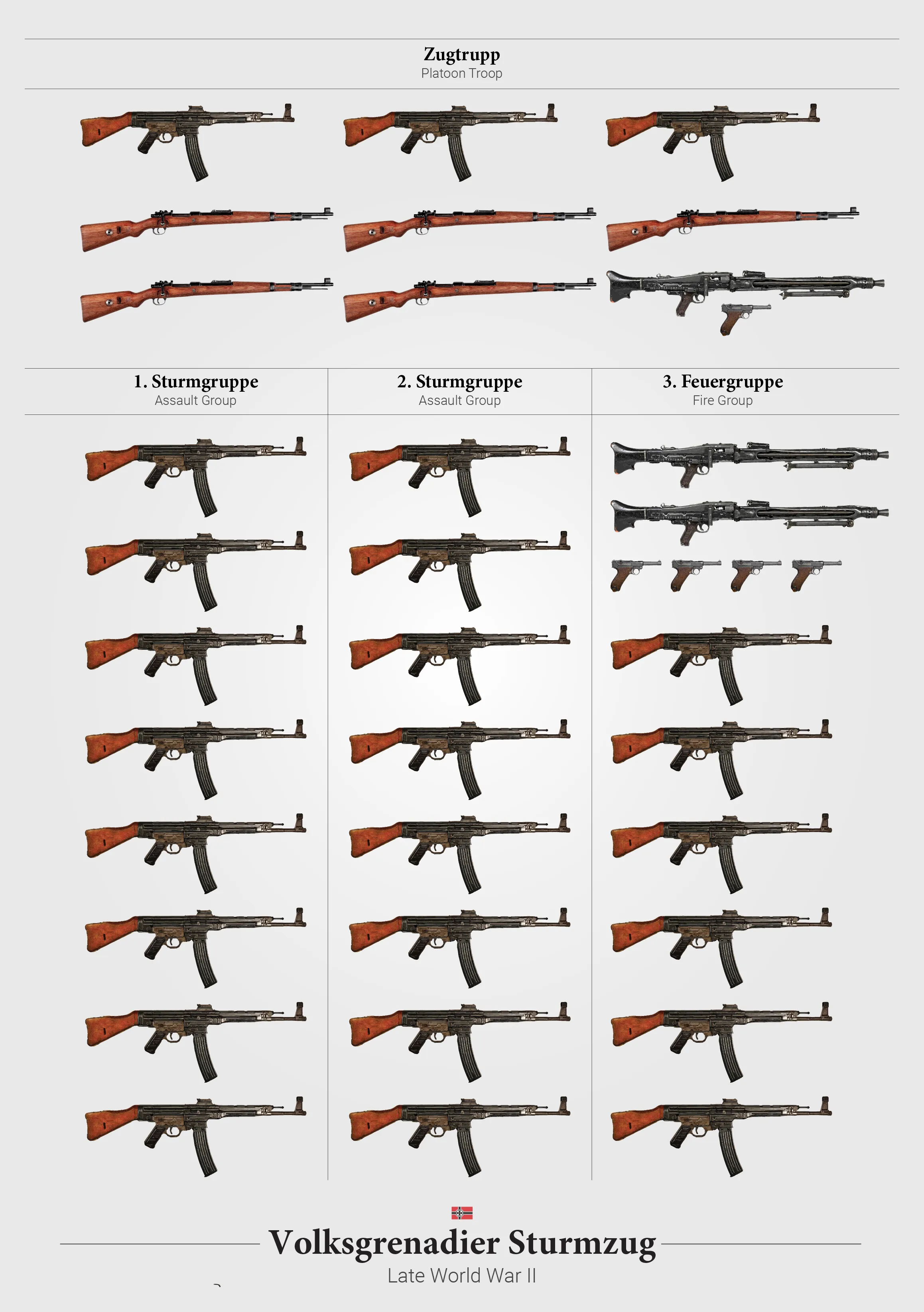 初期的德军,除了机枪之外,火力还是非常不足的,即便是有机枪,但是其他步枪手在面对苏军的SVT40和波波沙的时候,还是会被压的死死的。为了对付SVT40,德国人后来开发了G43半自动步枪,为了压制波波沙,德国人又开发了突击步枪。后期德军的突击队,甚至一整排装备的都是STG44突击步枪,班组火力上是远超其他对手了。