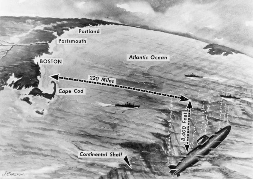 1963年4月9日,长尾鲨号核潜艇和云雀号(USS Skylark)潜艇救援船在波士顿外海350公里处汇合,准备进行一系列海试。