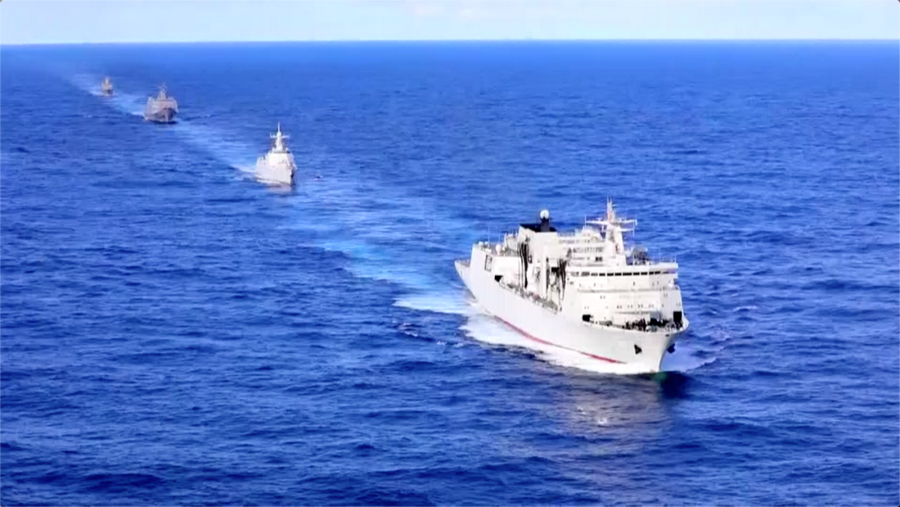 据央视军事2月28日报道,南部战区海军远海联合训练编队,近日展开实弹射击演练,检验编队对海打击和整体防空能力。银川舰、衡阳舰、五指山舰和查干湖舰,迅速组成对海打击队形,开火解除海面“威胁”,击落“来袭”靶机。此外,编队还进行了战时补给演练。银川舰、五指山舰和天枢星船,与综合补给舰查干湖舰组成“两横一纵”补给队形。