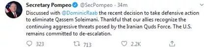 就在特朗普此次发推前不久,美国国务卿蓬佩奥3日一早也发布推文,称美国致力于缓和紧张局势。他在推特表示,他已与英国外交大臣多米尼克•拉布进行交谈。他说:“与多米尼克•拉布讨论了最近的决定——(我们)采取防御行动消灭卡西姆•索莱马尼。感谢我们的盟友认识到伊朗‘圣城旅’构成的持续的侵略威胁。美国仍致力于缓和紧张局势。”