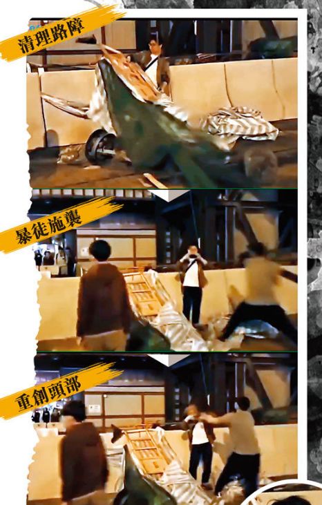 男子顿时双手下垂,上半身瘫倒在路障上失去知觉,而袭击暴徒则迅速转身离开,一旁还有人以粗言秽语谩骂被袭击者。过后,遇袭男子开始恢复知觉,但已头破血流,鲜血直淌在路障上,此时有急救员上前查看事主伤势,伤者则显得反应迟钝。随后防暴警员到达,先安排伤者在警车上接受护理,再由到场的救护车送往广华医院治疗。