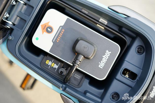 说起电池,由于整辆车很难找到钥匙孔,所以打开车座需要捏住车闸再按自定义键才能打开。之所以说很难找到钥匙孔而不是无孔,是因为Ninebot在座位下面非常隐蔽的地方留了一个钥匙孔,为的是应对紧急情况可以通过它打开后座取出电池。