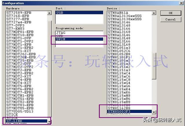 2 STM系列单片机的烧录软件、工具以及烧录方法STM具有8位和32位两个版本,STM8可以用IAR for STM8来编程,用STVP来烧录,所用到的工具为STLINK,烧录软件的使用基本上大同小异。STVP在烧录STM8时,需要配置硬件工具,选择STLINK,编程方式选择SWIM,然后选择型号。如下图所示。