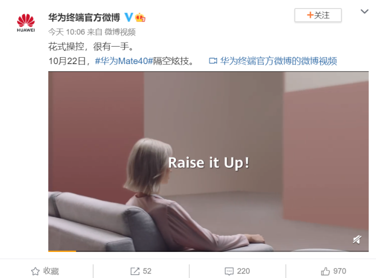 品玩10月17日讯,今日,华为终端官方微博在最新发布的预热视频中曝光了华为Mate40 系列的一些新功能。视频显示,华为Mate40系列通过隔空操作可以实现隔空播放和暂停音乐、隔空切换下一首歌曲、隔空增加手机音量。