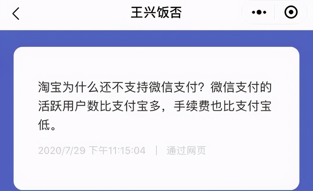 网友们也纷纷摆出了证据,但美团的斗志似乎也愈发高涨。其CEO王兴还曾在网上发文表示,淘宝为什么不支持微信支付?微信支付的活跃用户比支付宝多,手续费也比支付宝低。