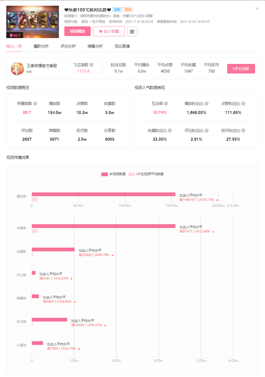 其中“王者荣耀官方客服”的《❤热爱105℃的对抗路❤》,通过对歌曲的二次改编创作,结合游戏动画,做到良好的传播,视频发布后收获了154万播放量、10.2万的点赞量。