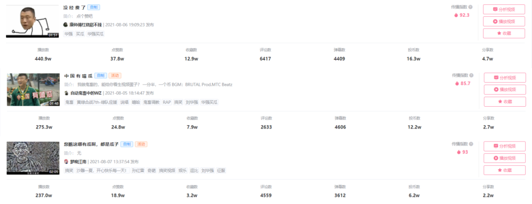 以近7天播放量最多的热门素材为例,通过快速站内热门题材,大致可以把近期热点划分为3个主题:奥运相关、吴姓艺人、刘华强买瓜。
