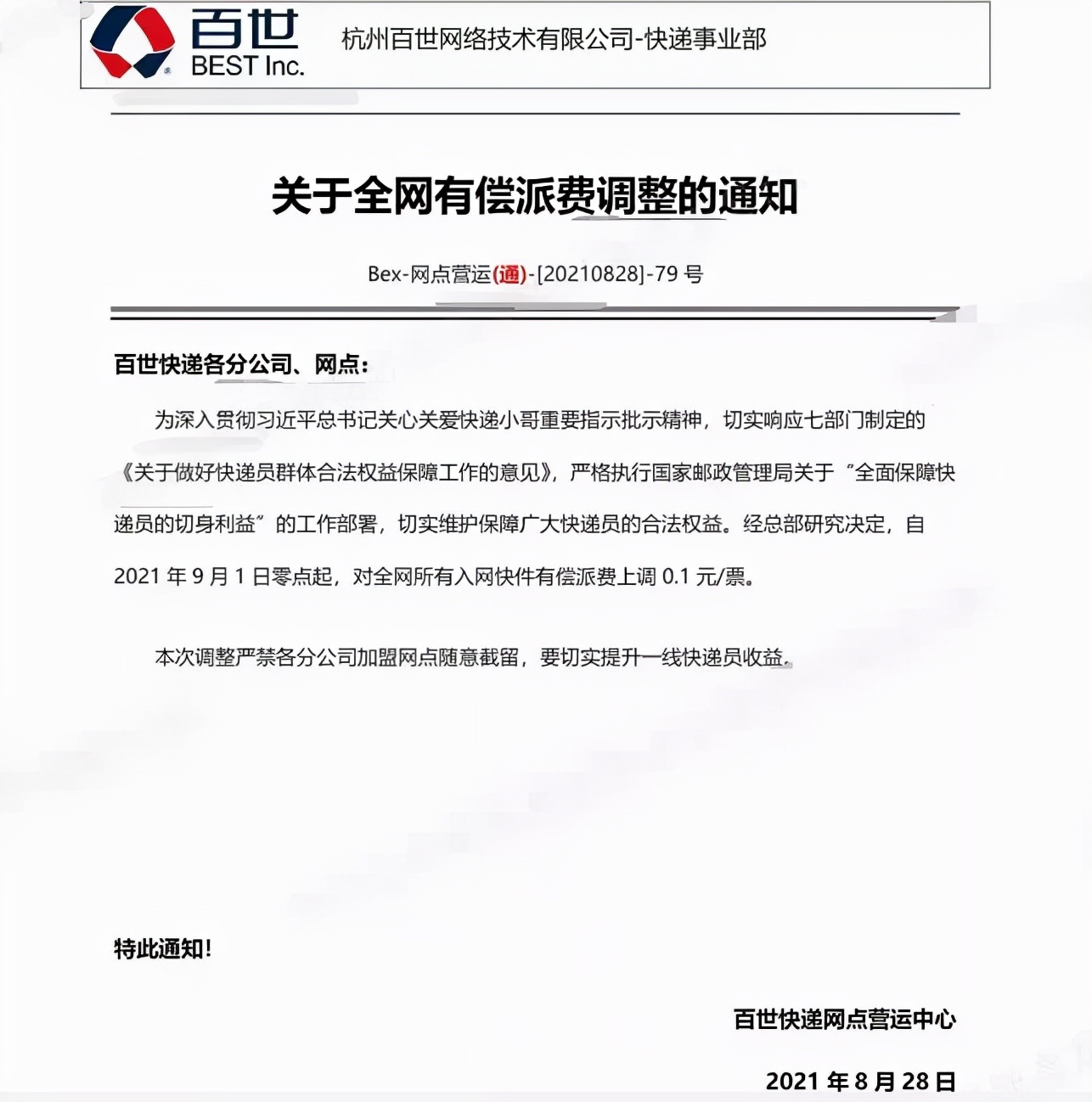 8月28日,百世官宣跟进涨派费0.1元/票,强调严禁加盟网点随意截留。